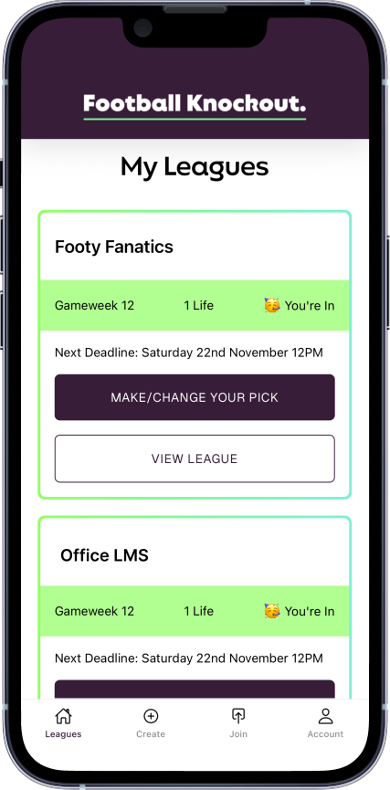 Create or join a league with friends, colleagues and team mates